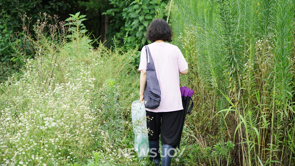 노훈심 의왕맹꽁이대책위원회 위원장이 의왕 월암지구 맹꽁이 포획·이전 작업을 하기 위해 맹꽁이 서식지로 이동하고 있다. 뉴스앤조이 나수진