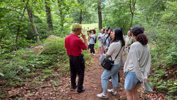 달성군 가창면에 있는 ‘루소숲’을 찾은 사람들이 숲에 관한 설명을 듣고 있다.